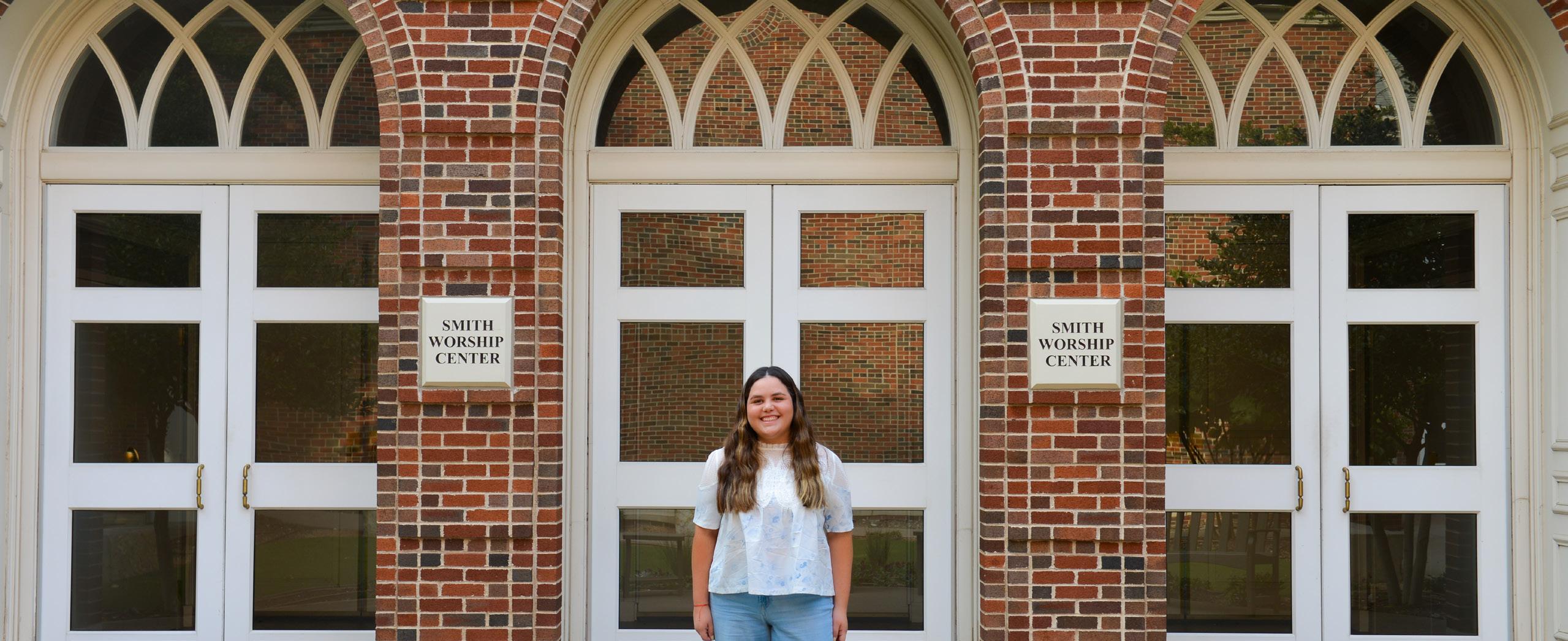 Vanessa stands outside Smith Worship Center where she first starting volunteering in The Storehouse’s food pantry back in 2019. This fall, Vanessa stood on stage in this same hall addressing over 200 neighbors to share resources available through Project Hope.