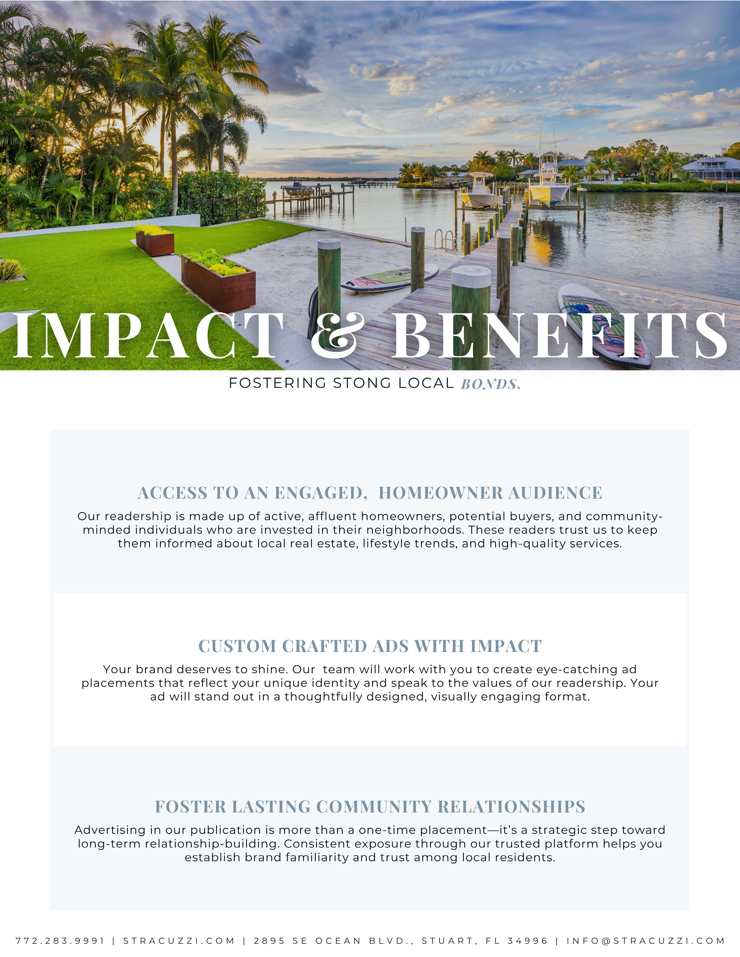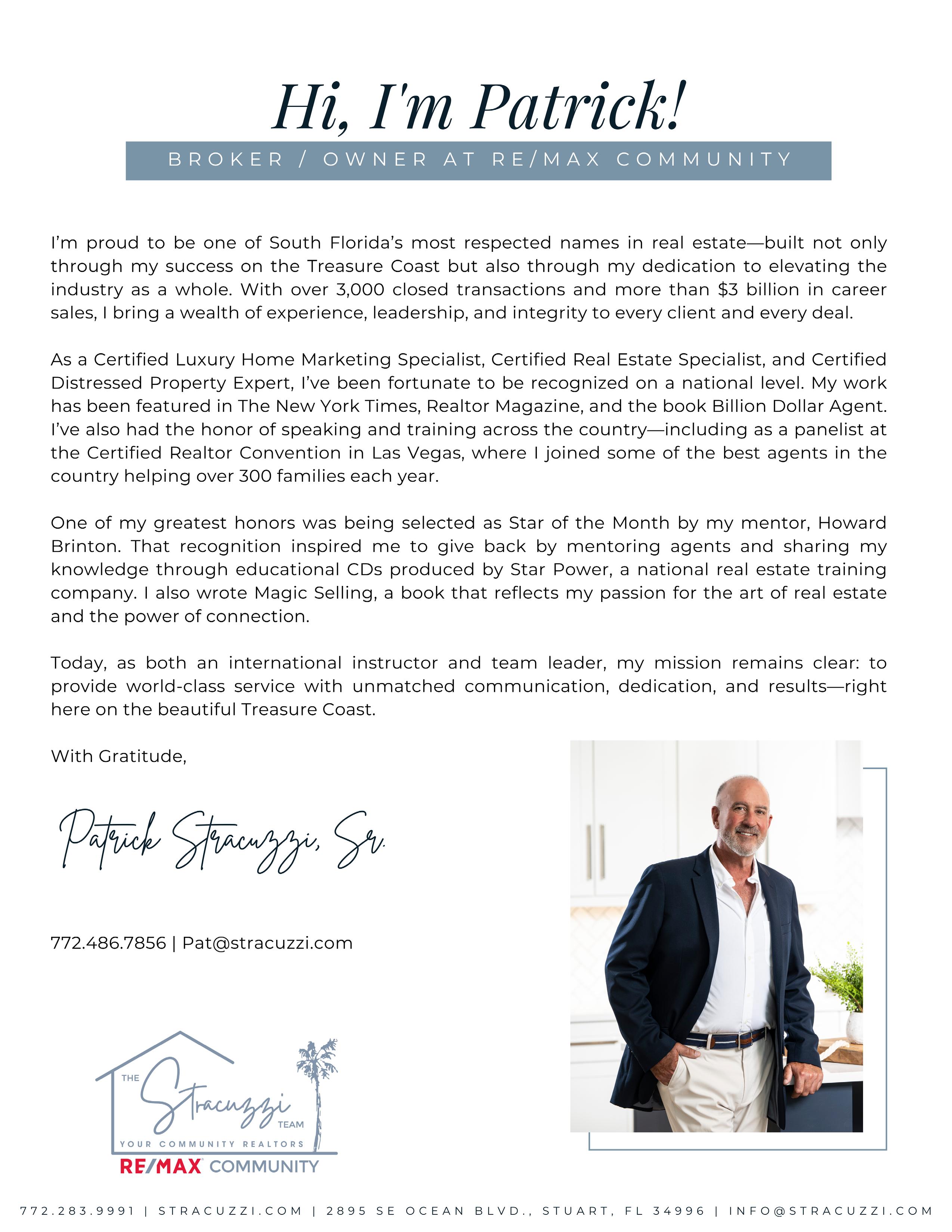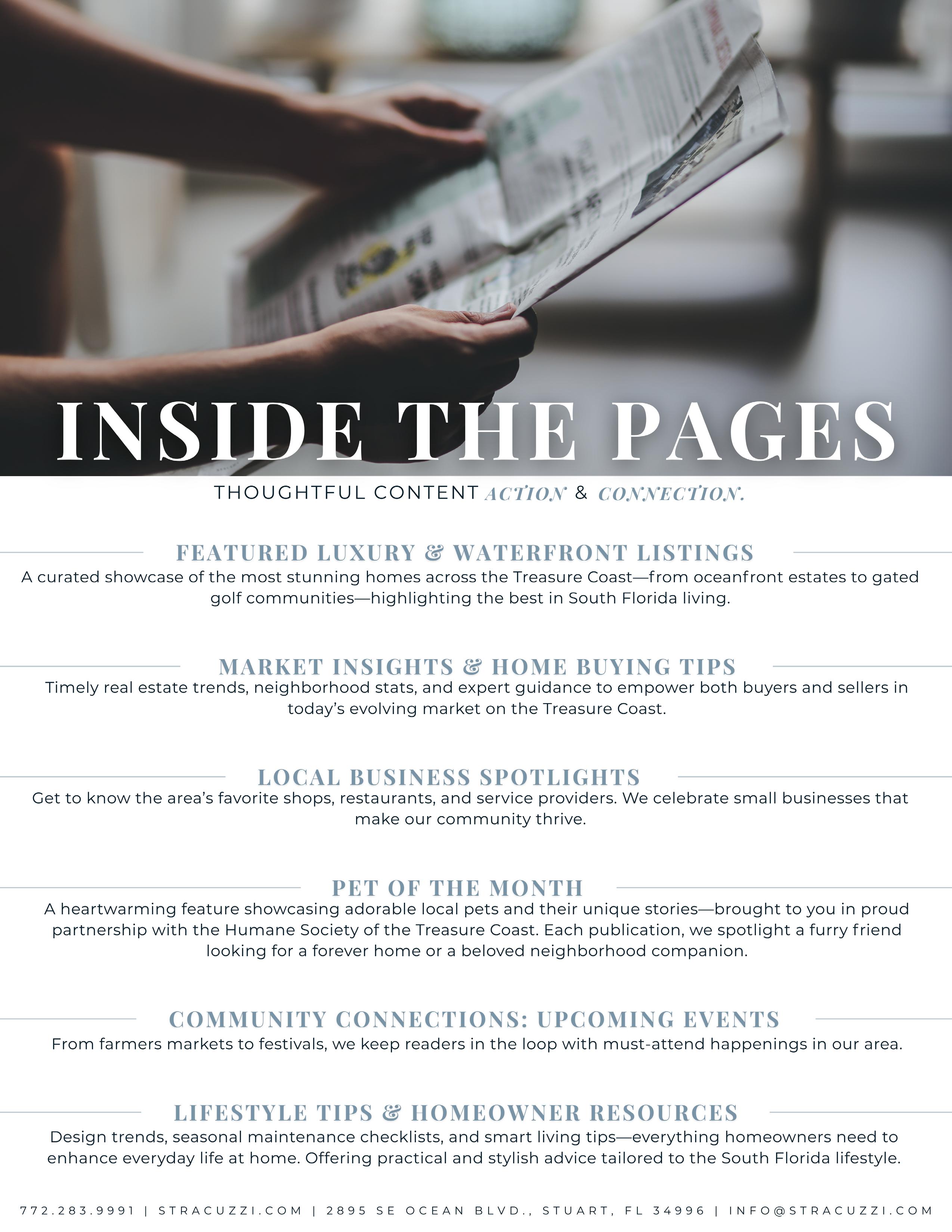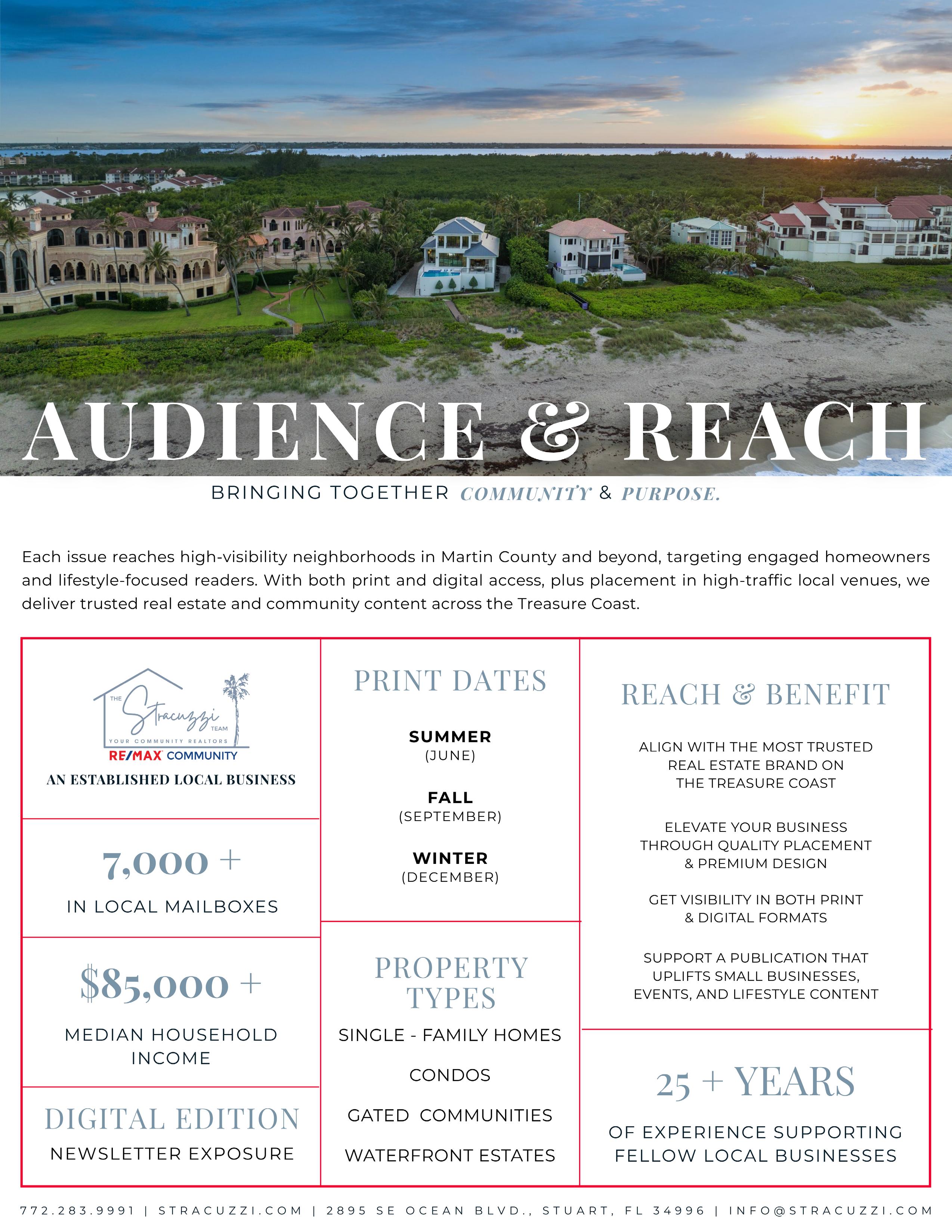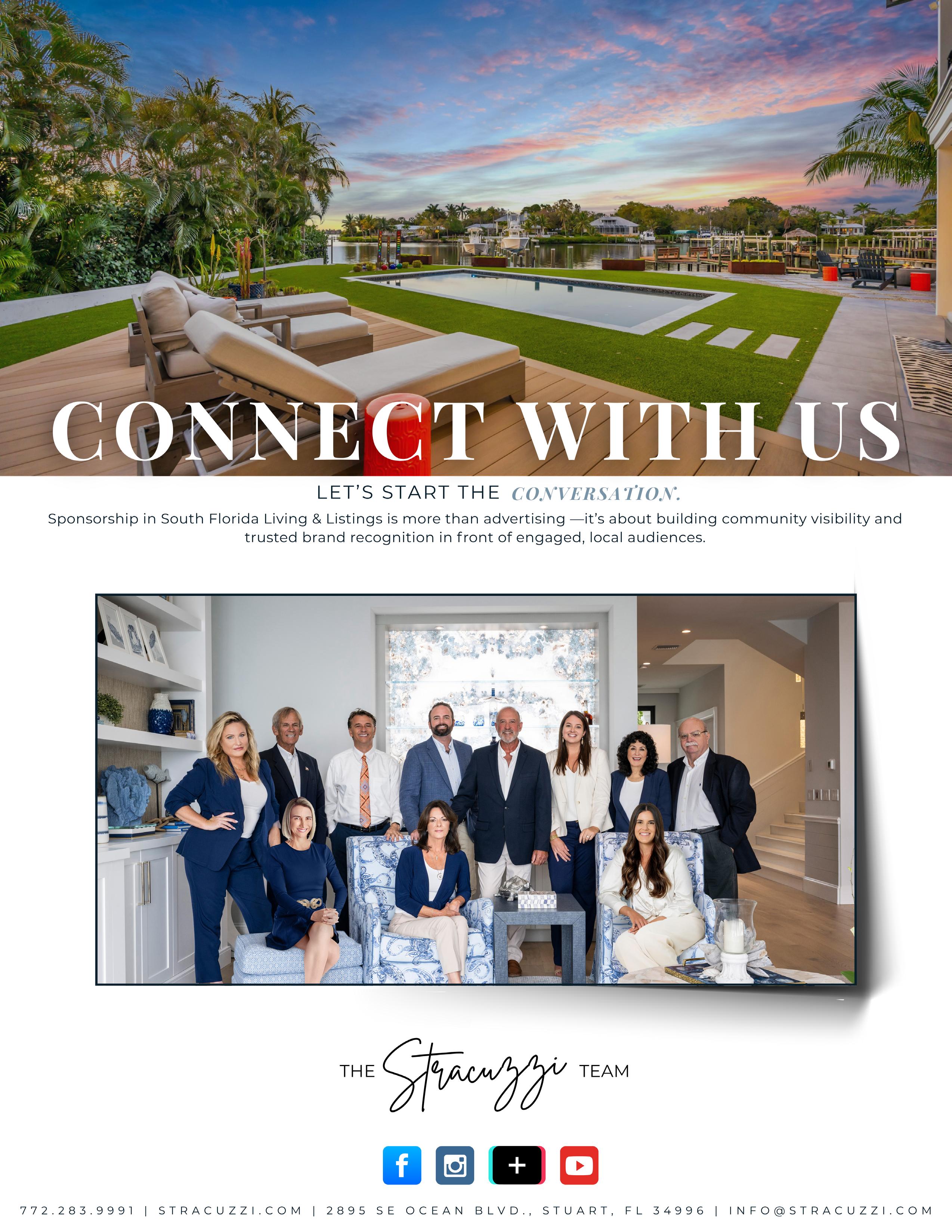 South Florida Living & Listings is a quarterly, full-color real estate and lifestyle publication proudly produced by The Stracuzzi Team at RE/MAX Community, the #1 real estate team on the Treasure Coast. Rooted in both real estate expertise and a deep love for the local area, this community-based newspaper serves Martin County and beyond by connecting readers with the very best of South Florida living.