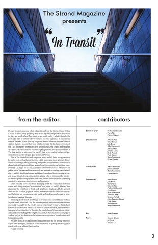 from the editor It’s easy to spot someone who’s riding the subway for the first time. When it starts to move, they go flying; they stand up three stops before they need to; they go north when they mean to go south. After a while, though, the particular tiles of certain subway stations become ingrained in our mental map of Toronto. When Spacing Magazine started releasing buttons for each station, there’s a reason they were wildly popular: by the time you’ve used the TTC frequently enough to do it unthinkingly, the cracks and benches and music of some stations become highly personal. For many students at Vic, that station is Museum. For me, it’s that never-ending hallway at Spadina station and the elegant glass dome at Dupont. This is The Strand’s second magazine issue, and it’s been an opportunity for us to work with a theme that was a little looser and more abstract. In addition to looking at biking, running, and public transportation, we’ve taken a closer look at the potential these spaces have for creativity and political commentary. On pages 10 and 11, Jade Bryan interviews Roadside Attractions on public art in Toronto and how to match our artwork to our fast-paced world. On 12 and 13, Ariel Leutheusser and Blaire Townshend look at transit as a literal space for artistic experimentation, asking why so many murder mysteries involve public transportation and why Theatre Passe Muraille is situating much of its season on street corners and streetcars. More broadly, we’ve also been thinking about the connection between transit and things that are “in transition.” On pages 14 and 15, Elaine Chan examines the evolution of Joual and Québécois language debates around class and art. And on pages 18 and 19, Bahar Banaei talks about the disconnect between her experiences with metal and underground music in postRevolution Iran and Toronto. Thinking about transit also brings us to issues of accessibility and politics. In post-Sandy New York City, the transit system is a microcosm of economic and racial inequality in the city. It’s also an opportunity for us to think about how we’ll deal with the future – in terms of climate research, speculative fiction, and urban planning. In Toronto, the condo boom brings out our cultural fascination with height for height’s sake, as Kris Kinsey discusses on page 8. And on page 9, Jen Roberton discusses misconceptions of homelessness and housing insecurity. We’ll be doing a second themed magazine issue in the spring semester. If you have thoughts, feedback, or are interested in getting involved, get in touch with us at editor@thestrand.ca. Happy reading.