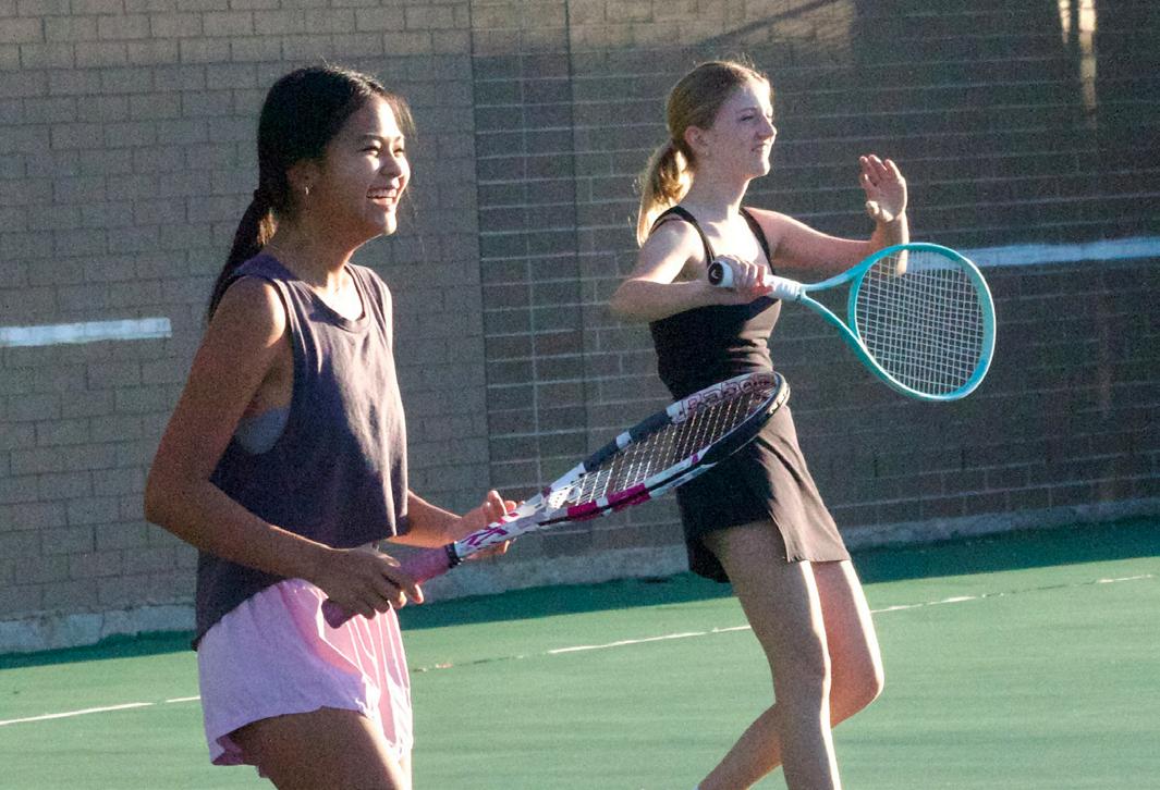 Naomi Santiago (10) and Melanie Hicks (10) rally during tennis practice