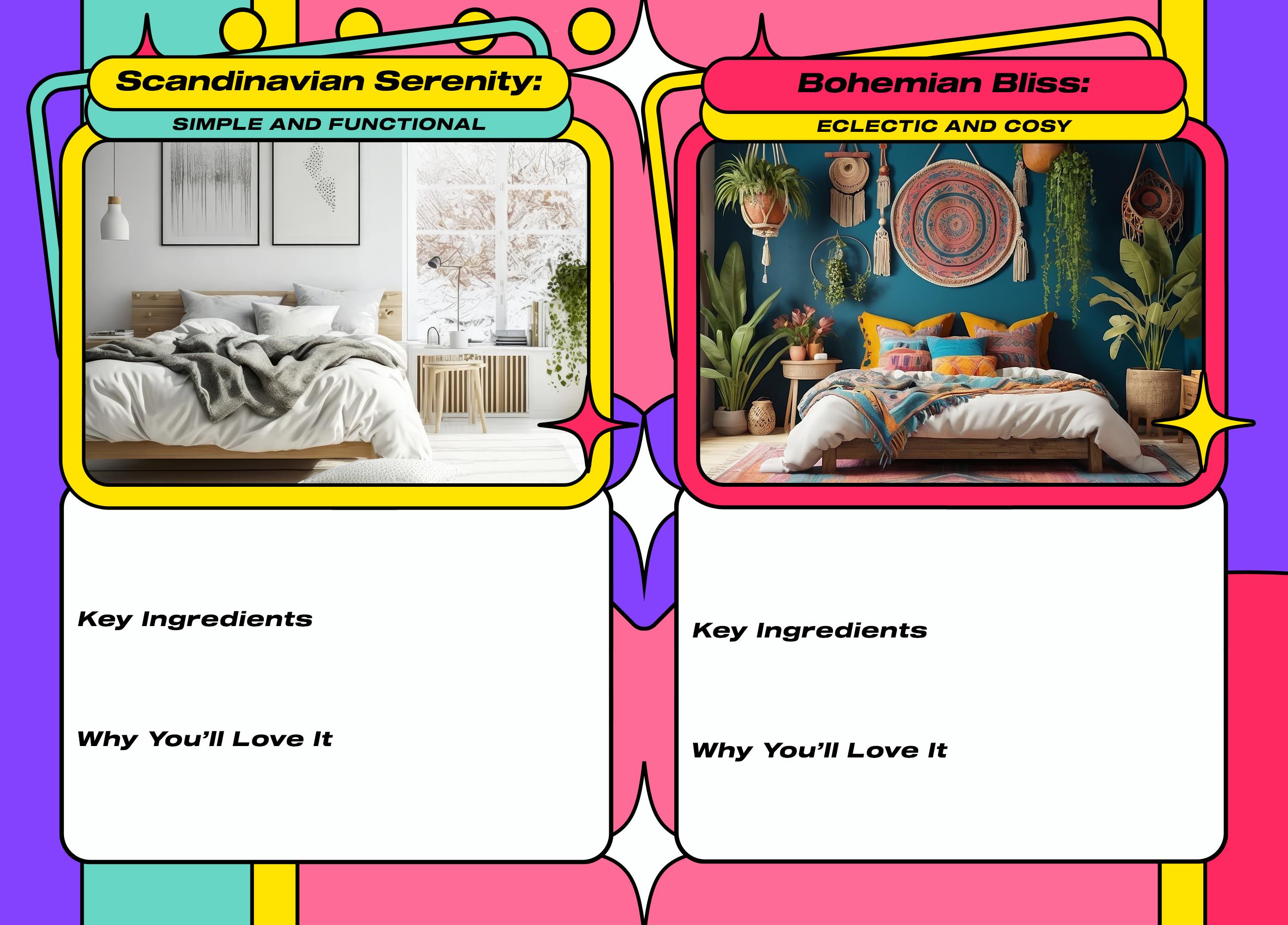 Light wood furniture: Adds a natural, airy feel to the room. Soft textiles: Think woollen throws, u y rugs, and linen bedspreads to create a cosy atmosphere. Neutral colours: Whites, soft greys, and natural tones with occasional muted pops of colour.