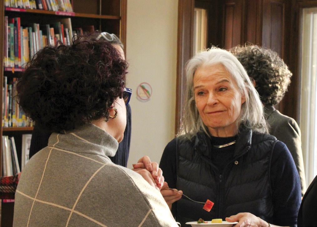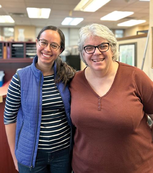 OLIVIA LI ’94 (L) AND SARAH MORGAN ’12 (R) ENJOYED RECONNECTING AND REMINISCING IN THE EVE MARSHALL LIBRARY.