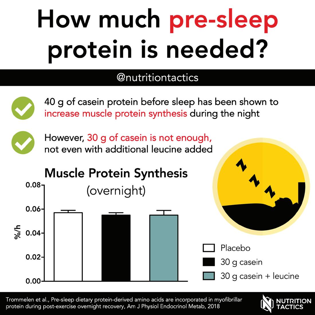 that “casein protein (~ 30-40 g) prior to sleep can acutely increase MPS [muscle protein synthesis] and metabolic rate throughout the night.” It is recommended that athletes who train in the early morning without eating or in the evening after dinner consider nighttime protein intake.