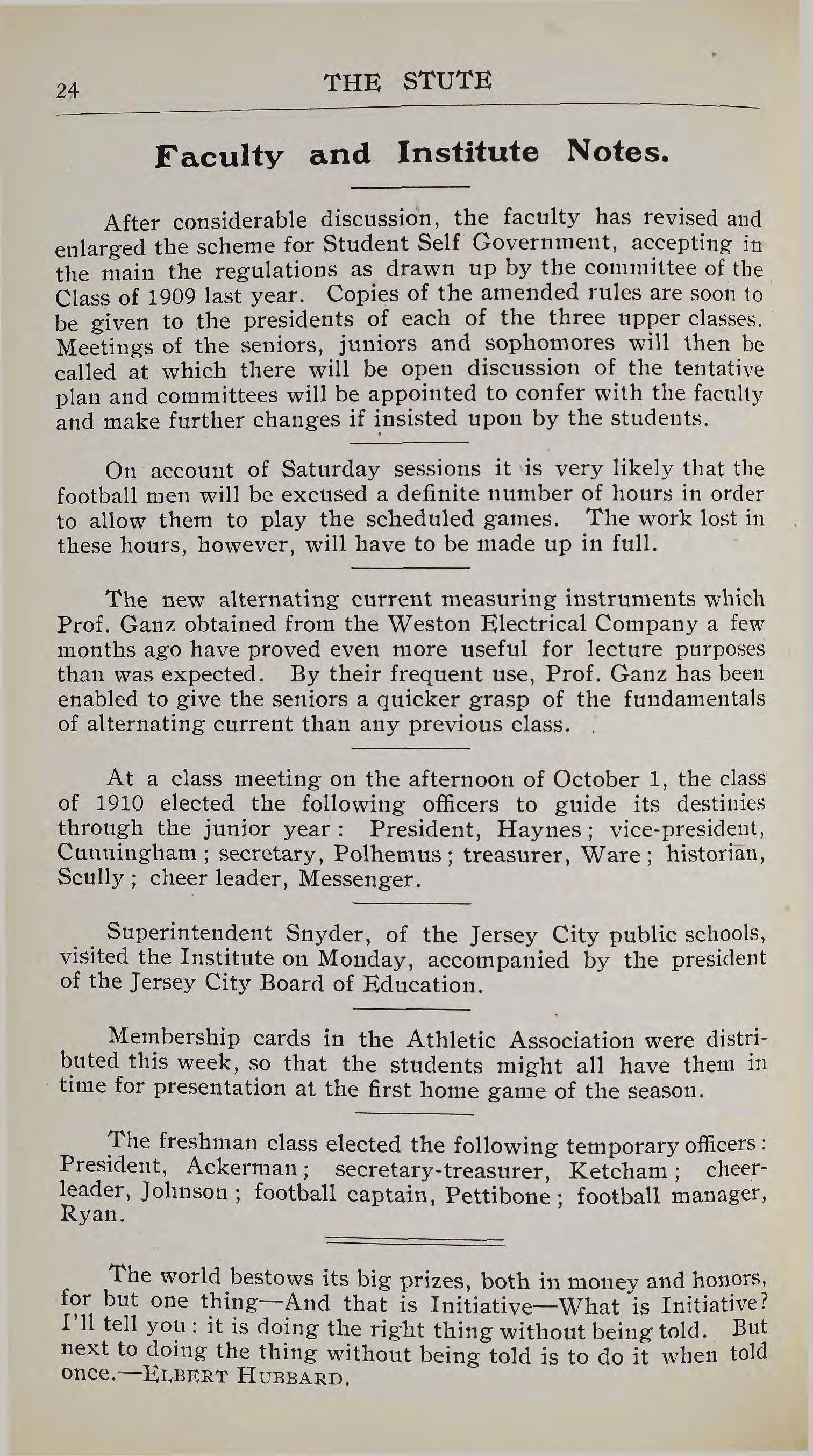 The first meeting was held Monday, September 28lh, in Dr. Denton's room when the activities for the coitaing year were discussed. The prospects for the season seem to look brighter than ever before. The lectures before tBe society, as well as the inspection trips arranged, open new opportunities for, the upper classmen to combine the useful with the agreeable. Efforts are now being made to establish connection between the practical engineering world and the hociety at Stevens, the results of which efforts the officers expect to make known in a later issue of THESTUTE.