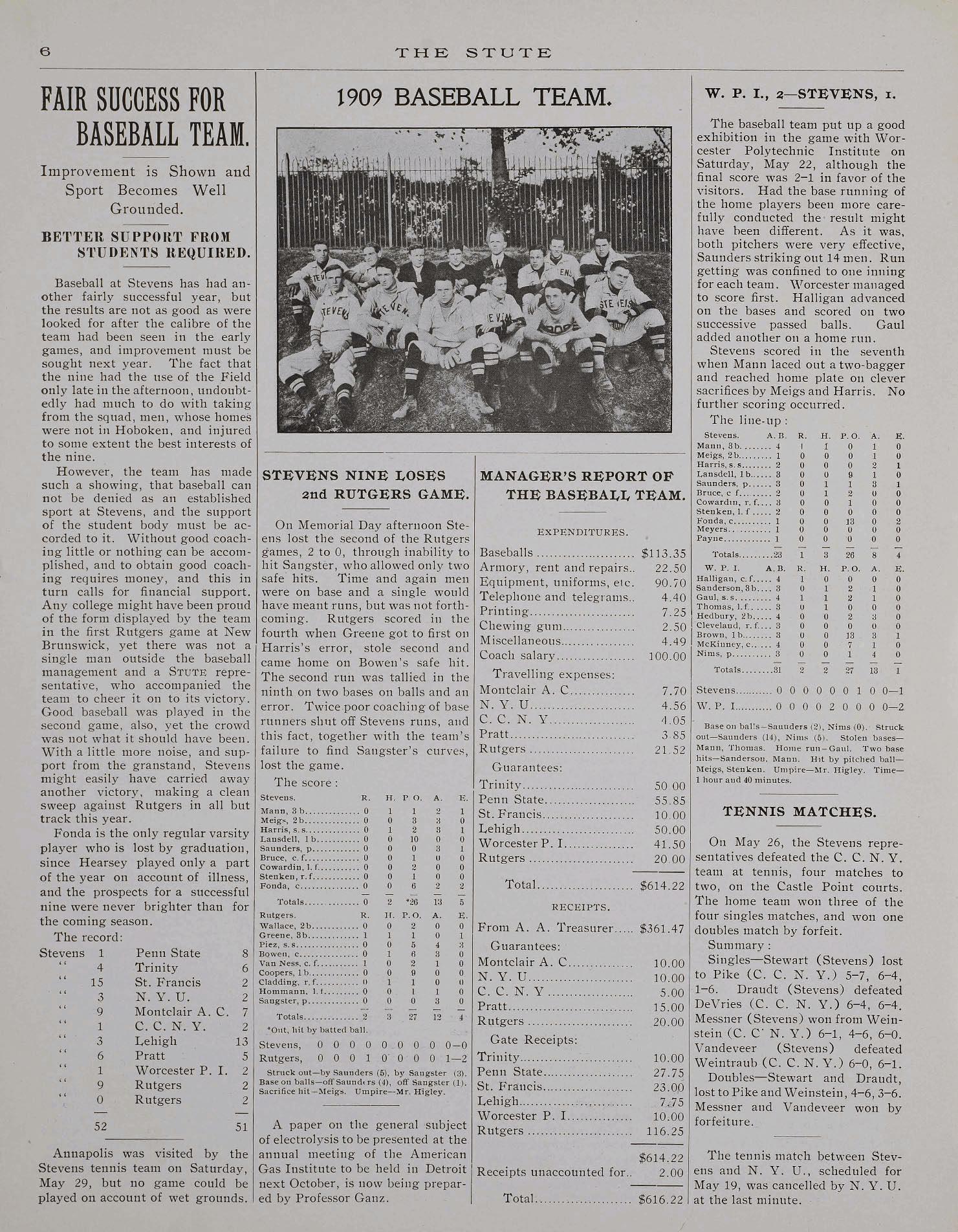 However, the tea hs mad, smch a showiw, that baseball car not be denied as &!I establishe< sport at Stevens, and tile st~ppor of the student body mnst be ac corded to it Without gmd wach iw llttk or nothm~can be accom pli~hed,and to obtsin good coach ing requires motxy, and this ir turn calls for financial support Any coliege might have been prom of the form di5piayed by the team in the fimt Rutxers ~ameat Ne* Brnnswick, yet-the; was not e siugie man outside the bsscbsl management and a STWE repre sentative, who accompn~cd the tesm to cheer it on to its v~ct~ry Good baseball was played IZI the secoud game, alho, yet the cwwd was uot what it shmld have bee^