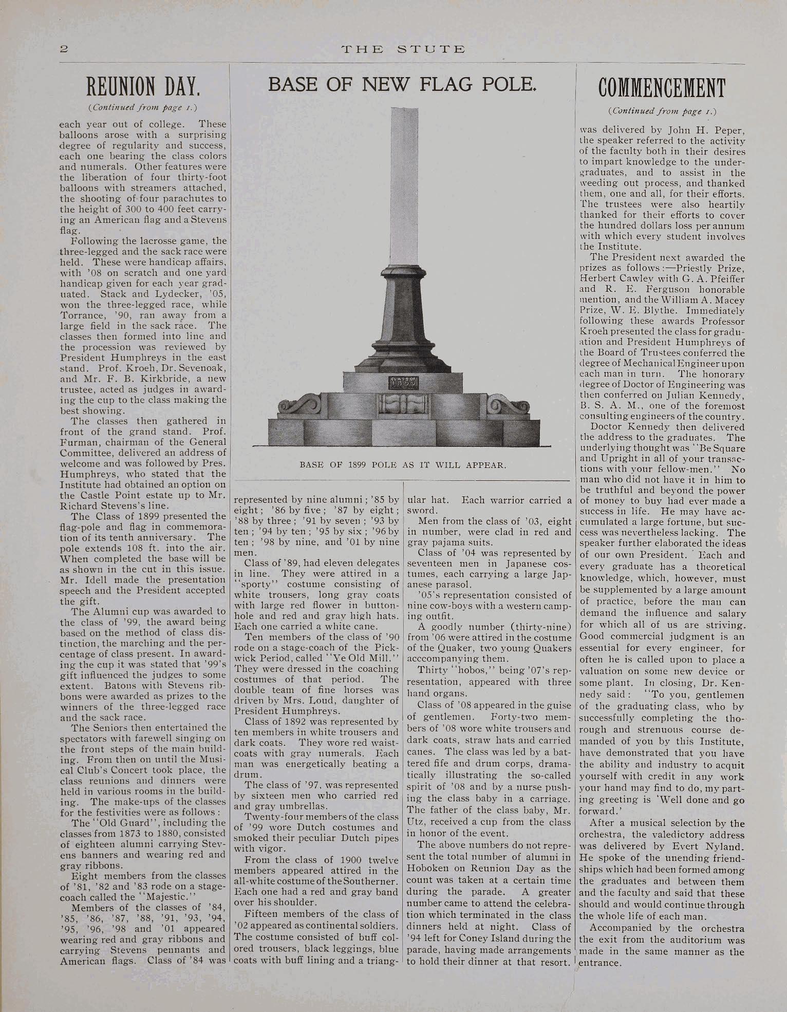 (Co"fwwd from fiage i ) each year out of college These balloons arose with a surprising degree of regularity and mecees, each one bearing the class eolors and numerals Other featureswere the liberation of four thirty foot balloons with streamers attached, the shooting of four parachutes to the height of 300 to 400 feet carry og an American flag and aStevens fl%oll~w"g the T~rnSegame, the three-lezo-~dand the sackracewere held These were handicap affairs, with '08 on scratch and one yard handmu elves for each >earmad uated Stack and Lydecker, '05, won the three legged raw, wh~k Torrance, '90, ran awa; from a large field 111 the sack race The classes then formed into line aud the picession was reviewed by President Humphreys In the eat stand Prof Kroeh, Dr Sevenoak, mfl Mr P B Kitlibride a "ew trustee, acted as judges in award >ragthe cup to the class making the best showing