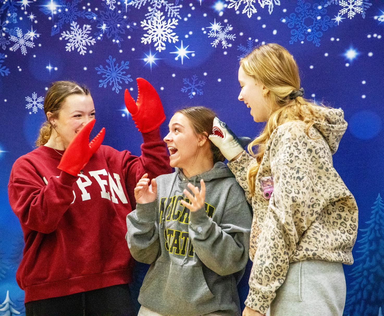 Freshmen Katie Gentile (left) and Alexis Prieto (right) surround Peyton Helton for a snow globe photo. The photo machine was accompanied with various props such as crab claws and false teeth.