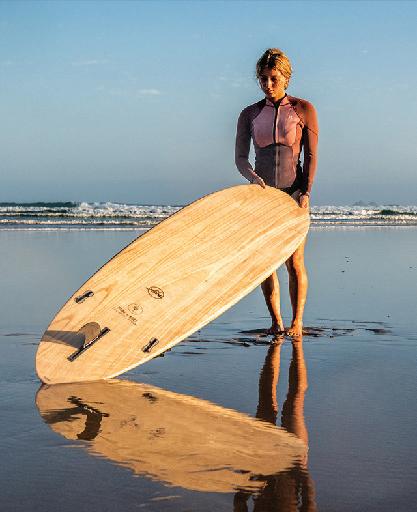 ECO SKIN IS A GAME CHANGER FOR ECO-CONSCIOUS SURFERS, USING RECYCLABLE EPS FOAM, PAULOWNIA TIMBER, AND LOW-VOC EPOXY RESIN.