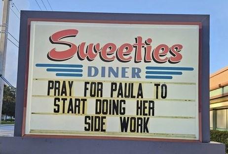 On August 27th, the sign read, “Pray for Paula to start doing her side work,” a dig at a Sweeties' server and local favorite that co-workers say is sometimes less than helpful at rolling silverware.