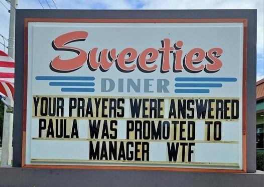 On Sunday, September 3rd, Sweeties put up a new sign, "Your Prayers Answered, Paula Promoted to Manager WTF."