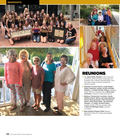 A The Beta Delta Chapter at the University of Arizona celebrated their centennial over Founders Day weekend. Special facility tours and other unique activities marked the special occasion. B Sheridan Cravens Morris, Linda Rieger, Kathy Adamson Jordan, Kristin Krueger Mueller, and Sallie Strobel Wilson, members of the 1966 new member class of Beta Iota/ Colorado, reunited in Santa Rosa beach. C Barbara Timmerman Voorheis, Caryle Steffee Merrill, Sherla Jennings Alberola, Donna Reuling Gainer, Marcia Kierland Henry, Polly Palen Elder, Jan Morford Stewart, and Kathy Arnold Frakes, members of the 1955 new member class of Beta Pi/Michigan State, reunited on campus. D Beta Epsilon/Oregon State alumnae gathered for their 62nd reunion and snapped this photo.