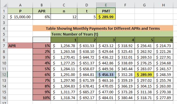 1. What are the two specific inputs, APR and term, for the highlighted payment of $456.33? 6% and 3 years