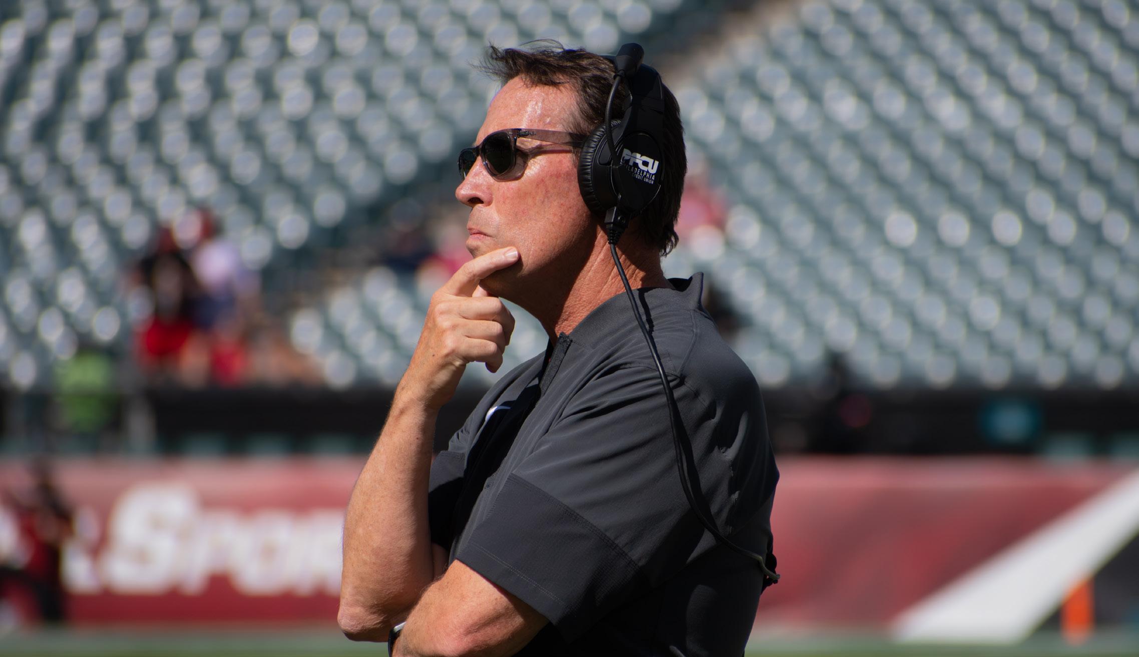 LILLIAN PRIETO / THE TEMPLE NEWS Head coach K.C. Keeler viewing a replay against UTSA on Oct. 4.