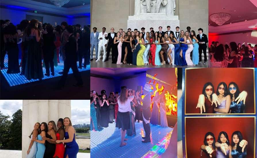 TOP LEFT Students celebrate on the dance floor; TOP MIDDLE Friends take photos at the Lincoln Memorial; TOP RIGHT Promgoers crowd at the Rockville Hilton; BOTTOM RIGHT Seniors pose at the photo booth; BOTTOM MIDDLE Prom king Kobina Asafu-Adjaye and prom queen Samantha Wu are crowned; BOTTOM LEFT Students head to D.C. to take Instagram pictures for their final prom.
