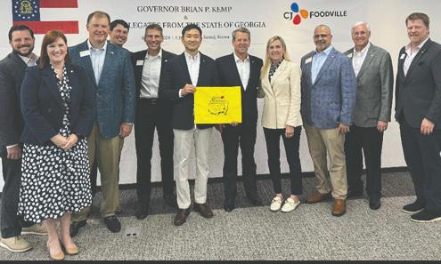 A State Delegation at CJ Foodville in Seoul, South Korea. Governor Brian Kemp and First Lady Marty Kemp joined the Greater Hall Chamber Business Delegation and presented Mr. CH Kim, CEO of CJ Foodville, with a 2024 Masters Flag signed by Gainesville’s own 1973 Masters Champion Tommy Aaron. (L-R) Andrew Carnes, Georgia Power; Tate O’Rouke, Jackson EMC; Brian Daniel, Carroll Daniel Construction; Brett Fowler, Turner Wood & Smith Insurance; Tim Evans, Greater Hall Chamber; CH Kim, CJ Foodville; Governor Brian Kemp; First Lady Marty Kemp; Eric Chini, Rochester/ DCCM; Tim McDonald, Lanier Technical College; Philip Wilheit, Jr., Wilheit Packaging. CJ Foodville is constructing a new $47 million food manufacturing headquarters in the Gainesville 85 Business Park to produce bakery items for the company’s growing Tous Les Jours branded café-bakeries across North America. The facility is expected to be complete in 2025 and will employ 285 new jobs.