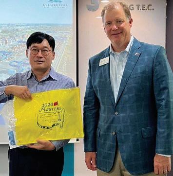 Brian Daniel, Carroll Daniel Construction, presents Masters flag to John Yoon, CEO of Jinsung TEC, in Seoul, South Korea.