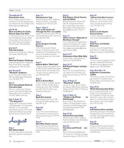 home calendar Through July 25 Planetarium show 8 p.m. Fridays, except for July 4. University of North Georgia Coleman Planetarium, 82 College Circle, Dahlonega. jjones@ung.edu. July 25-26 Show and Shine for Cystic Fibrosis Open Car Show 5-7 p.m. July 25, 8 a.m. to 7 p.m. July 26. 639 Edelweiss Strasse, Helen. All proceeds will be donated to the Cystic Fibrosis Foundation. 706-795-2264, 706-296-6896. July 26-27 Folk Life Festival All day. Unicoi State Park, 1788 Ga. 356, Helen. 706-878-2201. July 27 National Dragster Challenge Atlanta Dragway, 500 E. Ridgeway Road, Commerce. www.atlantadragway.com, 706-335-2301. July 28 and 30 “Macbeth” Auditions 6 p.m.. The Holly Theatre, 69 W. Main St., Dahlonega. hollytheatre. com, 706-864-3759. July 31 2014 Canoe/Kayak National Championships 8:30 a.m. . Lake Lanier Olympic Venue, 3105 Clarks Bridge Road, Gainesville. Free for spectators. 770-287-7888 or lckc.org. July 31-Aug. 10 “The King and I” Habersham Community Theatre, 1370 Washington St., Clarkesville. 706-839-1315, www.habershamtheater.org. July 4: Fireworks Celebration, Banks County High School, Homer. 706-677-3510.