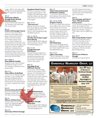 home calendar Lodge, 1788 Ga. 356, Helen, 800573-9659, www.GeorgiaStateParks. org. Pre-registration required. Oct. 6 University of North Georgia Senior Recital: Hannah Lumme 3-4 p.m. Gloria Shott Auditorium, 322 Georgia Circle, Dahlonega. Free. www.ung.edu Oct. 6 Foxfire Fall Heritage Festival 10 a.m. to 5 p.m. The Foxfire Museum and Heritage Center. Rabun County Civic Center/ Clayton City Hall Complex, Ga. 76 West, Clayton. Food, music, contests, exhibits and demonstrations of mountain crafts and skills. Admission: $5, ages 5 and under free, maximum admission of $20 per immediate family. Proceeds benefit Foxfire’s Local Educational Programs and the Foxfire Mountaineer Festival 2014. www.foxfiremountaineer.org. www. foxfire.org, 706-746-5828. Oct. 7-Nov. 7 Sloan Bibb Art Exhibit Reception 6 p.m., Oct. 24. MasonScharfenstein Museum of Art, 567 Georgia St., Demorest. www. piedmont.edu Oct. 7-11 Police Officer Craft Week 10 a.m. to 5 p.m. Monday through Saturday, 1-5 p.m. Sundays. INK Interactive Neighborhood for Kids, 999 Chestnut St. SE No. 11, Gainesville. $1 with paid admission to museum. Members free. inkfun. org. Oct. 8 Concert Series, Don Williams 8 p.m. Cumming Fairgrounds, 235 Castleberry Road, Cumming, 770781-3491, www.cummingfair.net Oct. 8 History of Helen Event 5:30 p.m. Helen Arts & Heritage Center, 25 Chattahoochee St., Helen, 706-878-3933, www. helenarts.org Oct. 10 University of North Georgia homemagazinenorthgeorgia.com