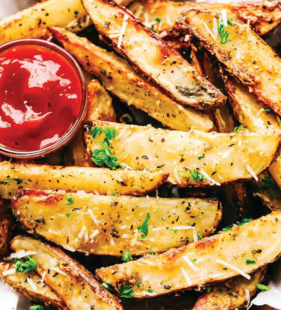 1. Preheat oven to 400 degrees. Cut each 3-4 large russet potatoes lengthwise in half. Cut each half into three wedges.