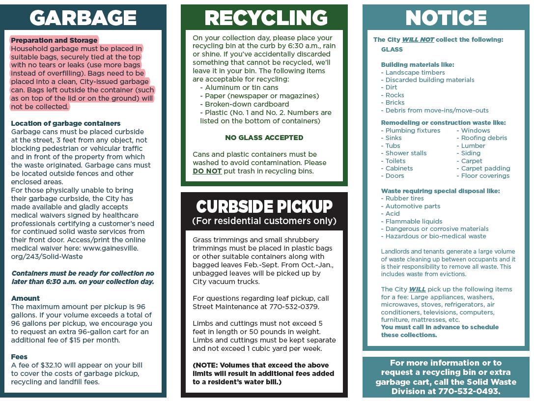 •TRASH CANS Trash cans and Recycling cans must be stored out of view from the street or neighboring properties. Also, they should only be put out at the curb no earlier than 5:00 pm the day before pick up and put away no later than 9:00 pm the day of pickup. Plastic bags are not permitted and should be put in a trash can. Structures on the side of the home to hide trash cans are NOT permitted;