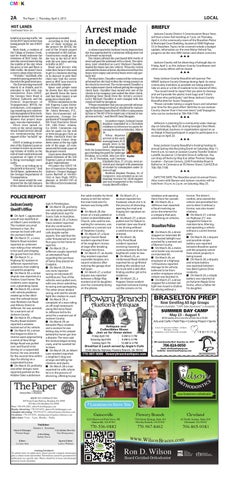 sign in Pendergrass. ■■ On March 30, profanity was also spray painted on the subdivision sign for Scenic Falls in Hoschton. ■■ On March 29, a Trotters Trace resident reported that she continued to receive harassing phone calls despite earlier reports. She said that the caller threatened to send four guys to her home to rape her. ■■ On March 29, a Jefferson couple reported an attempted fraud regarding the purchase of items they placed on Craigslist. ■■ On March 29, three cars were reported racing on Interstate 85 northbound. Two of the vehicles were pulled over, with one driver admitting to racing and apologizing. The other driver denied racing, and said he would fight the citation in court. ■■ On March 29, a complaint of a man riding an off-road motorcycle along McCreery Road in Jefferson led to his arrest for a warrant out of Jackson County. ■■ On March 29, an Ednaville Place resident and a woman he was letting stay in his camper behind his home got into a dispute. The man said the woman began acting crazy, and he wanted her to leave. ■■ On March 29, an Albert Lane resident reported a neighbor’s dog was at large and killing her chickens and ducks. ■■ On March 28 a man reported his wife, whom he is in the process of divorcing, offering to pay