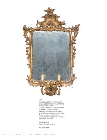 172 SPLENDIDA COPPIA DI SPECCHIERE IN LEGNO DORATO, PROBABILMENTE NAPOLI XVIII SECOLO a cornice modanata e fregio superiore a grande roccaille con foglie. Laterali a rampicanti, volute, foglie e roccailles, che si ripetono nella parte bassa, centrata da due braccia in metallo dorato. Specchio a mercurio. Misure cm. 103 x 65. PROVENIENZA Illustre famiglia romana E 1500-2500