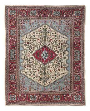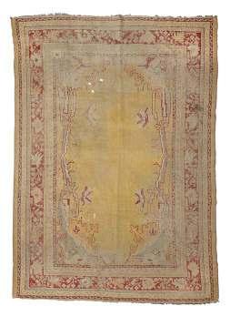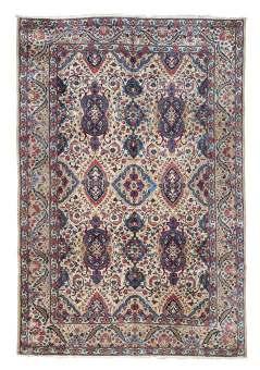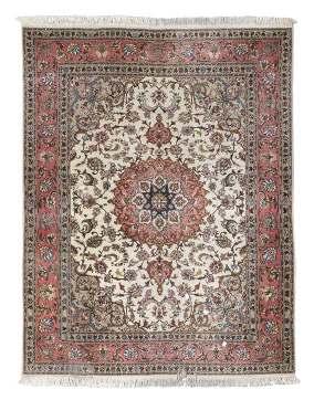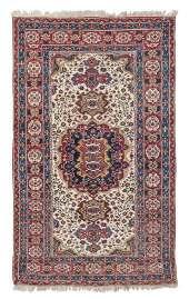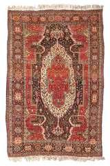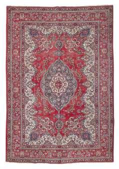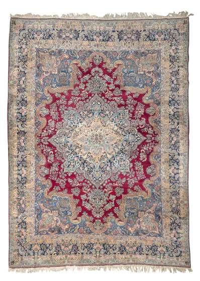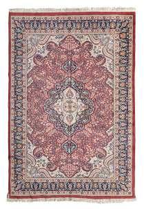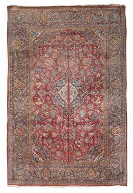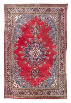 TAPPETO PAKISTAN, METÁ XX SECOLO con medaglione arabescato e motivi secondari a tralci di iori, nel campo centrale a fondo rosso. Misure cm. 270 x 180.