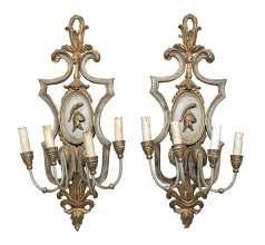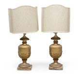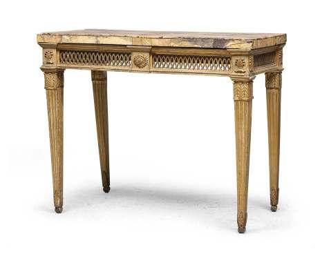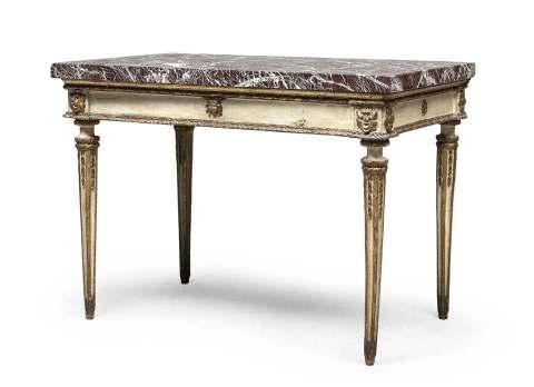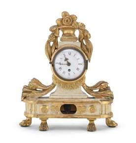 PENDOLA DA TAVOLO IN LEGNO LACCATO, FINE XVIII SECOLO con initure dorate. Cassa a torretta scolpita a drappeggi e vaso con iori e foglie sul cappello. Base a piedi ferini. Quadrante a smalto bianco con doppio disco con indici a numeri romani e cifre arabe per i minuti. Movimento in metallo liscio, pendolo libero.