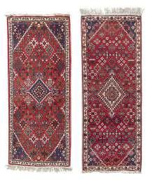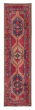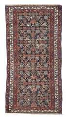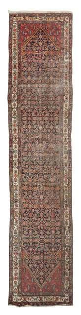 TAPPETO HAMADAN, 1900 ca. con medaglione romboidale e motivi secondari a rombi, artigli e simbologie, nel campo centrale a fondo rosso. Misure cm. 195 x 105. Abraches.