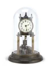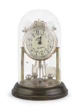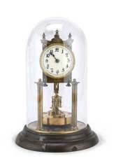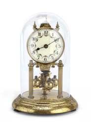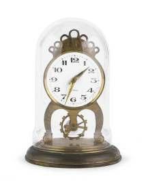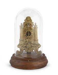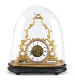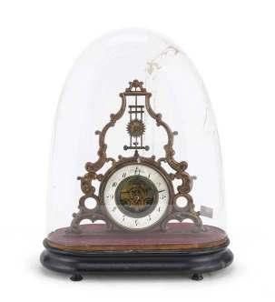 OROLOGIO SCHELETRICO DA TAVOLO, XIX SECOLO in metallo dorato decorato a volute. Quadrante bianco a smalto con numeri romani agli indici, movimento a vista con sistema a pendolo conico. Sulla platina reca iscrizione ‘Medaiile de bronze, brevetè, nr 36413’. Completo di campana di vetro su base in legno.