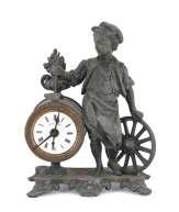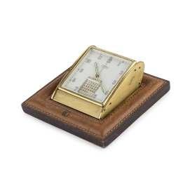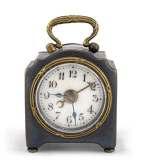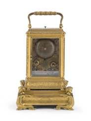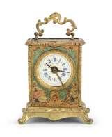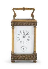 PENDOLETTA DA VIAGGIO, AUSTRIA XIX SECOLO in bronzo dorato e decorato a rilievo con igure vegetali ed animali. Quadrante bianco a smalto con numeri romani, vetri molati ai lati. Movimento meccanico a carica manuale con scappamento a cilindro e ripetizione ad ore e quarti, con sveglia.