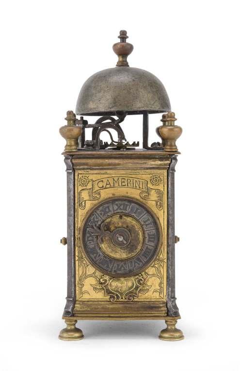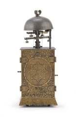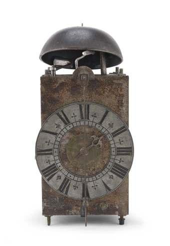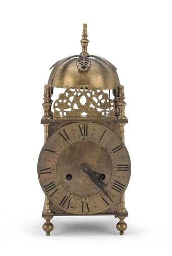 OROLOGIO A LANTERNA, XVIII SECOLO con cassa in ottone e ferro. Quadrante bianco con indici romani e minuti a numeri arabi. Grossa campana dietro un fregio in bronzo decorato con animali e stemma araldico con tre gigli.