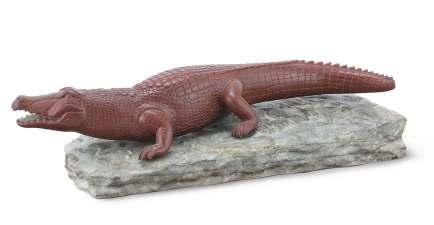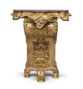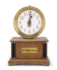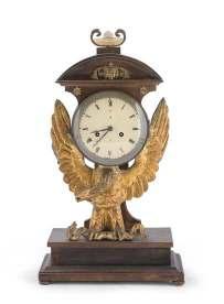 OROLOGIO DA TAVOLO, XIX SECOLO con fusto ligneo e scultura di aquila che trattiene un serpente in legno dorato sotto la cassa. In alto piccola vasca in alabastro con decorazione in metallo. Cassa in metallo con quadrante color avorio, numeri romani agli indici, due fori di carica. Movimento meccanico a carica manuale. Misure cm. 44 x 25 x 12.