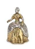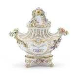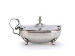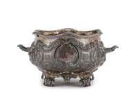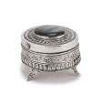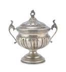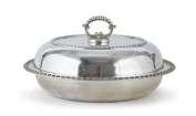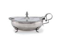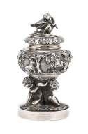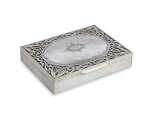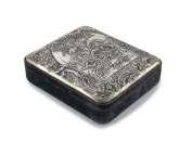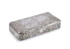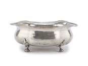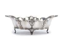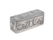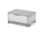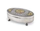 SCATOLA PORTA GIOIE IN ARGENTO, INIZI XX SECOLO a sezione ovale con coperchio cesellato a foglie d’acanto con applicazioni in metallo dorato cesellate a motivi vegetali. Piedi ferini.