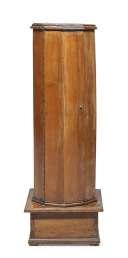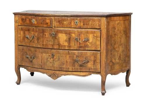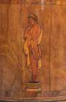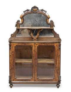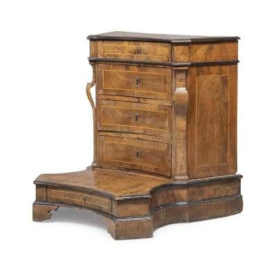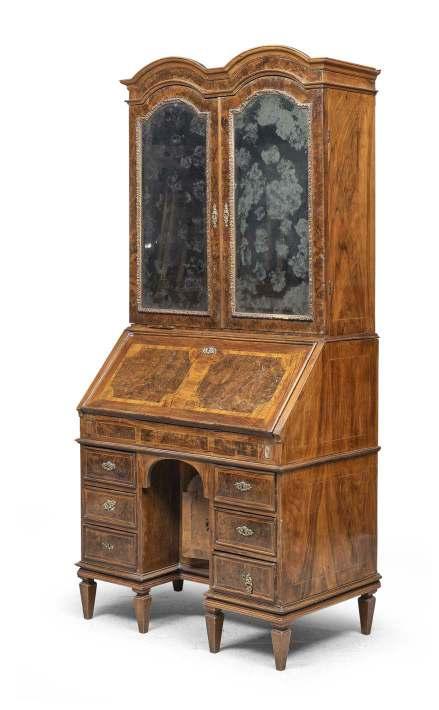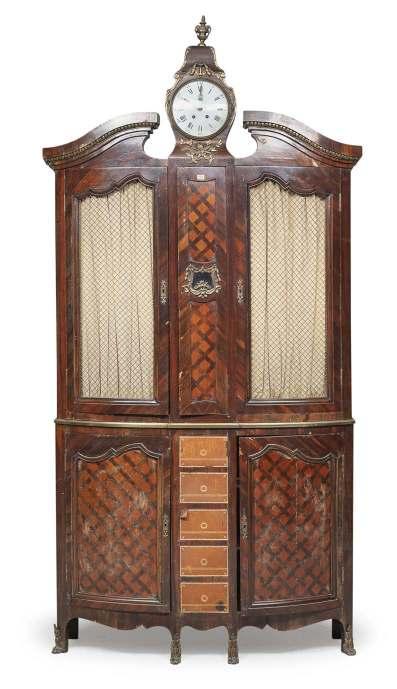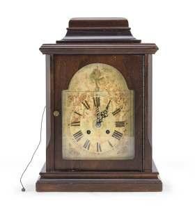 con cassa in ebano, con pinnacoli e maniglia in bronzo. Quadrante in metallo inemente cesellato e decorato a motivi vegetali, con numeri romani agli indici ed arabi per i minuti; piccola inestrella in basso ed apertura orizzontale, due fori di carica. In alto piccolo quadrante per la sveglia. Retro con movimento con decorazioni incise a volute e cesto di frutta, con fermo del pendolo, conoide con budello, sei martelletti per la suoneria dì sinistra, tirantino sinistro e due porte a vetri isse e due con aperture a chiave dipinte in verde all’interno.