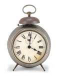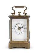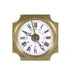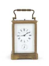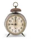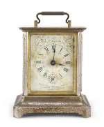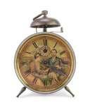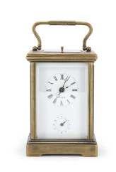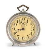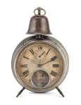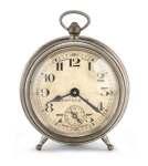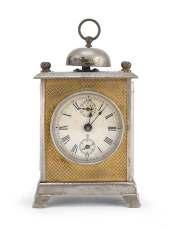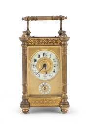 8 SVEGLIA A TAMBURO, FINE XIX SECOLO con cassa in ottone e quadrante bianco con indici romani, piccolo contatore sveglia ad ore sei e iscrizione ‘Reveil a Marche Silencieuse’.