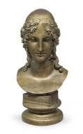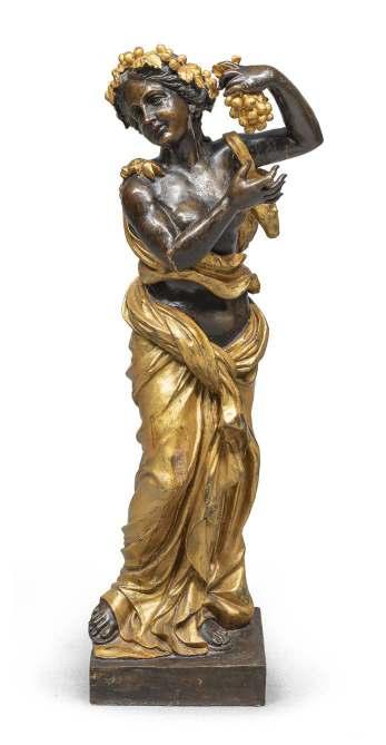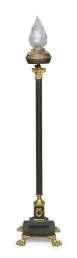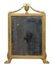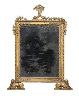 SPLENDIDA PENDOLA DA TAVOLO IN BRONZO DORATO, INIZI XIX SECOLO al mercurio, con cassa a torretta afiancata da allegoria femminile con braciere e colonna classica con vaso di iori. Base rettangolare, decorata a festoni e trioni, piedi a campanella.