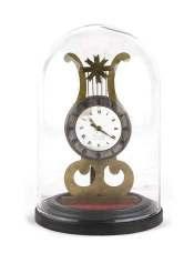 OROLOGIO DA TAVOLO, XIX SECOLO in metallo dorato con sagoma a lira. Quadrante bianco a cifre romane. Movimento meccanico a carica manuale. Completo di campana in vetro e base in legno ebanizzato. Misure cm. 16 x 15 x 4. Difetti alla campana.