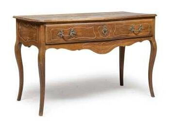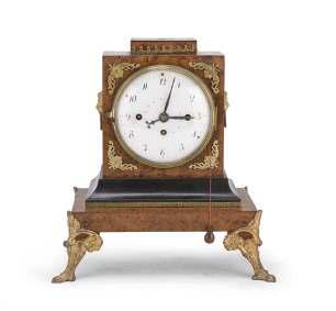 OROLOGIO DA TAVOLO, PRIMA METÁ XIX SECOLO con cassa in radica di olmo, decorata con elementi in bronzo a rilievo applicati. Quadrante bianco con indicazione delle ore a numeri arabi, tre fori di carica, calendario al centro del quadrante. Completo di foro per cordino, movimento con suoneria piatta visibile attraverso rosone traforato in metallo. Piedi aquilini in bronzo.