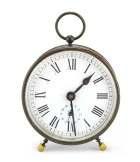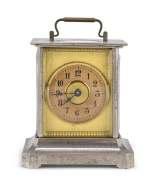 OROLOGIO SVEGLIA, XIX SECOLO con cassa in ottone con piccola maniglia da trasporto. Quadrante bianco con cifre arabe agli indici. Movimento meccanico a carica manuale con sveglia. Misure cm. 5,5 x 4,5 x 4.