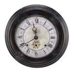 Quadrante con numeri romani agli indici, arabi per i minuti e due fori di carica. Movimento in ottone con fermo del pendolo, campana in ferro, sportello posteriore in vetro con apertura a chiave.