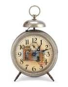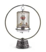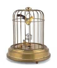 OROLOGIO CON AUTOMI, INIZI XX SECOLO a sagoma di piccola gabbia contenente automi in forma di piccoli volatili. Disco delle ore sulla base in ottone dorato con indicazione delle ore a numeri arabi. Movimento meccanico a carica manuale con sveglia a carillon. Misure cm. 18 nx 15. Difetti.