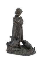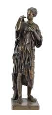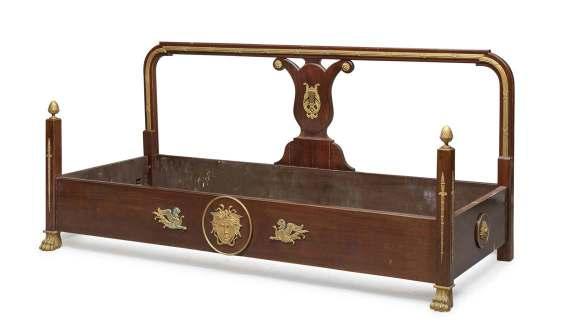 PENDOLA DA TAVOLO, FRANCIA PERIODO IMPERO in bronzo brunito e dorato al mercurio. Cassa a torretta con cornici a motivi vegetali, afiancata da igura di pastorello con lauto, pecorella e trioni allegorici. Base rettangolare decorata a festoni con piedi a mensola cesellata in bassorilievo.