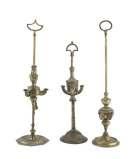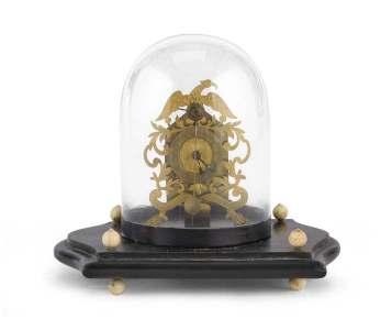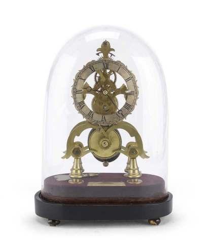 OROLOGIO SCHELETRICO, INGHILTERRA INIZI XIX SECOLO in bronzo dorato, con elementi a volute e piedi a campanella. Macchina a vista con corona a numeri romani. Completo di campana in vetro e base in legno ebanizzato. Firmato ‘Jackson London’. Misure cm. 27 x 17 x 10. Difetti.