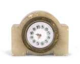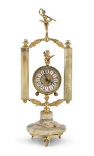 OROLOGIO DATAVOLO, XX SECOLO in marmo onice, con elementi e cassa in metallo dorato. Quadrante con numeri romani agli indici a cartelle. Movimento meccanico a carica manuale.