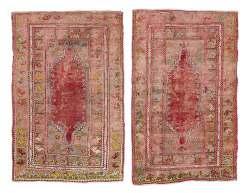 COPPIA DI TAPPETI ANATOLICI KIRKSHEIR, INIZIO XX SECOLO con medaglioni in rosso e motivi secondari a rosette nel campo centrale a fondo verde.