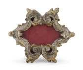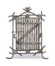 PORTAFOTO IN METALLO ARGENTATO, XX SECOLO sagomato a cancello rustico con cornice a tralci di vite.