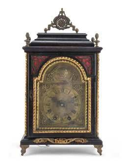 OROLOGIO DA TAVOLO, INIZI XIX SECOLO con cassa in legno ebanizzato con decorazioni, pinnacoli e maniglia in ottone dorato. Quadrante in ottone con decorazioni a rilievo applicate e scudo circolare con cesto di iori inciso.