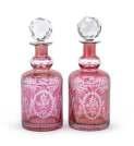 COPPIA DI BOTTIGLIE IN CRISTALLO, INIZI XX SECOLO a fondo rubino e trasparente, con incisioni al corpo a motivi vegetali. Tappi sfaccettati.