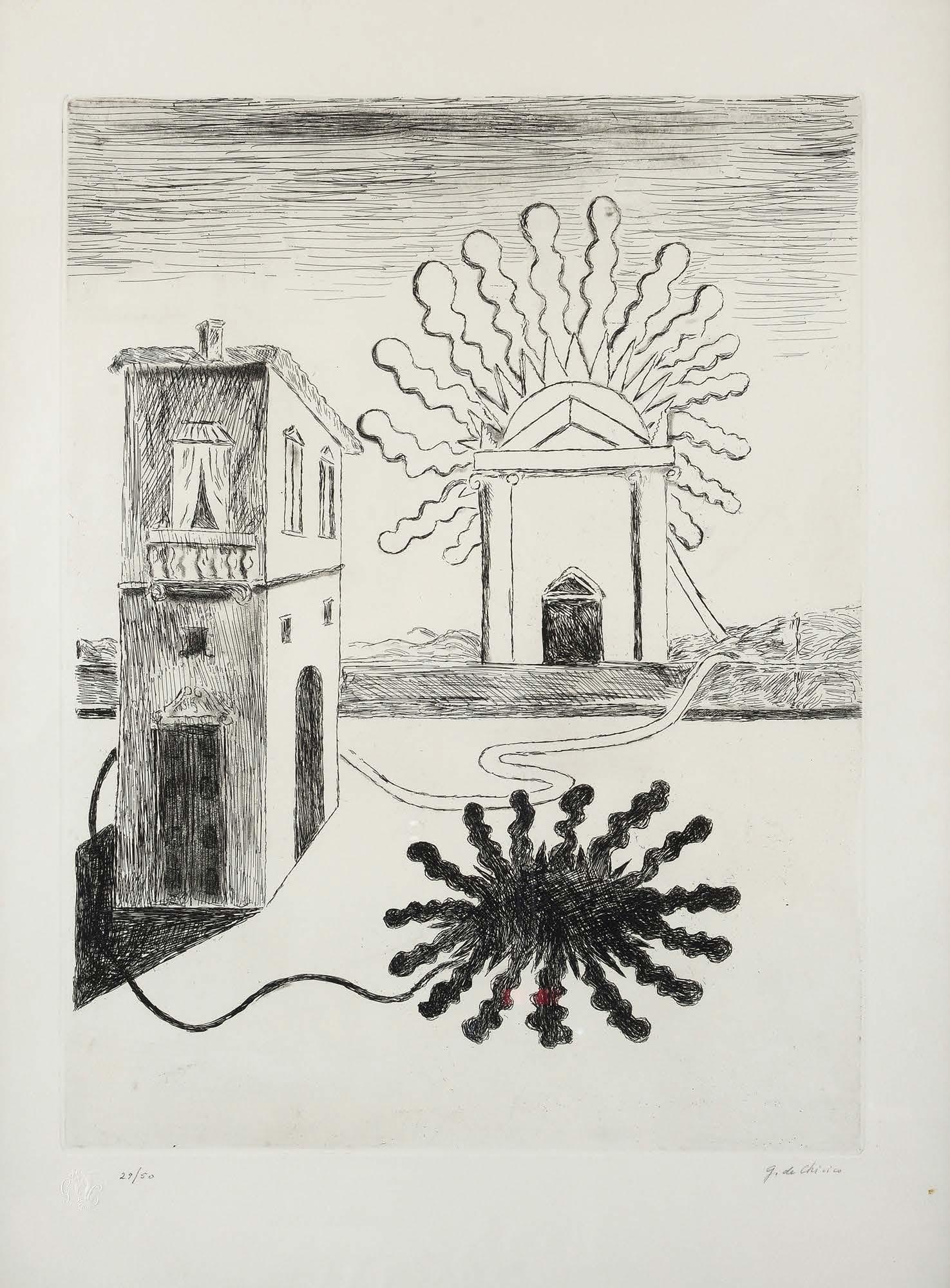 Acquaforte acquatinta, mm. 655x495; mm. 780x620 (foglio); Es 29/50 Firma in basso a destra; tiratura in basso a sinistra. Timbro a secco dell’Artista. Bibliografia: 1990, Giorgio De Chirico, Catalogo dell’Opera Grafica 1969 – 1977, Edizioni Bora Bologna, pag. 14. n. 1.